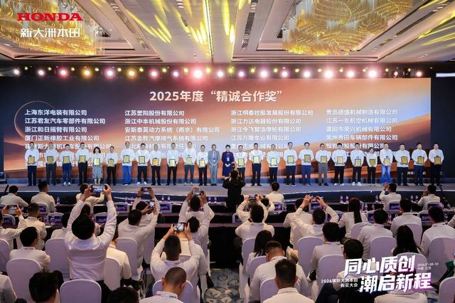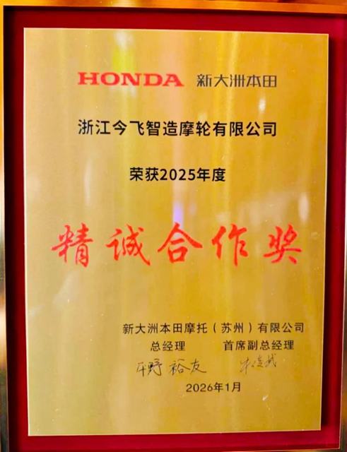 1月9日,以“同心质创 潮启新程”为主题的新大洲本田2025年度供应商大会在海南三亚隆重召开。浙江今飞智造摩轮有限公司凭借卓越的技术创新能力、严谨的品质管理体系及高效的供应链协同能力,荣获2025年度“精诚合作奖”。这不仅是新大洲本田对今飞智造综合实力的高度认可,更是双方多年携手同行、深度协同的又一里程碑,是“同心质创”理念最生动的诠释。